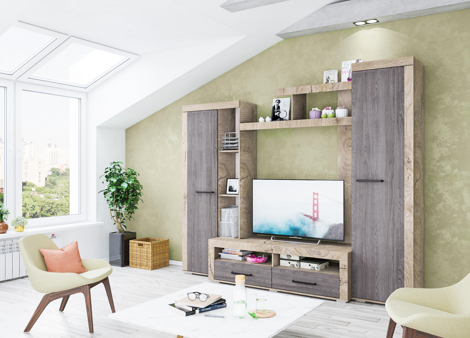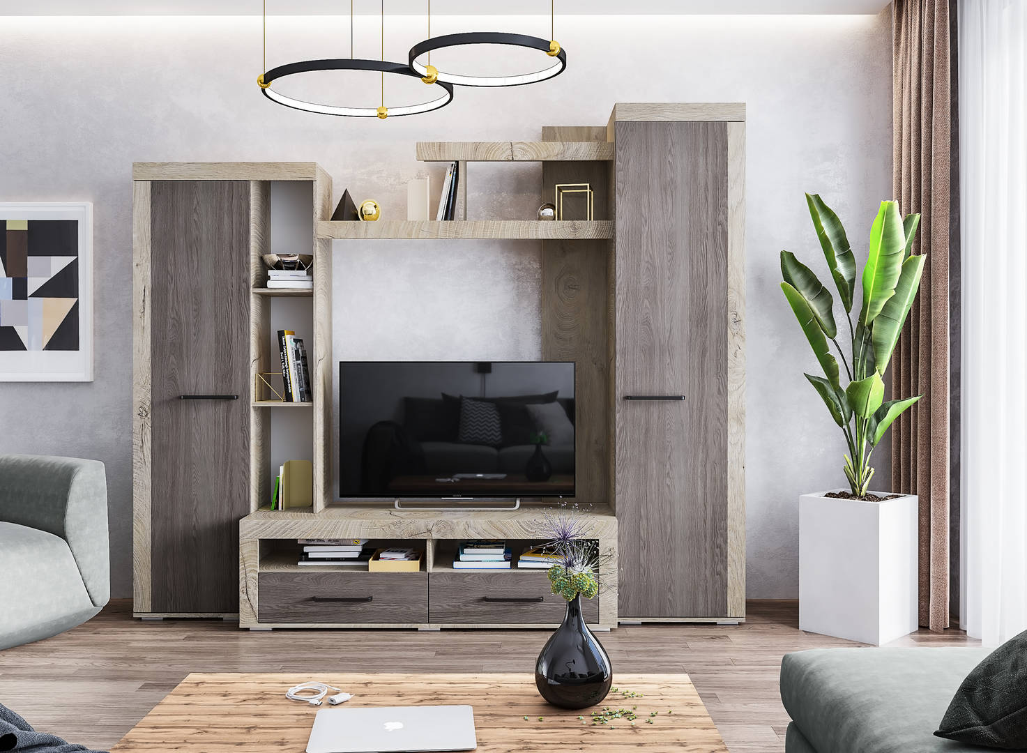 — Металлическая лицевая фурнитура цвета «Мокрый асфальт» подчеркивает изыск и статус гостиной