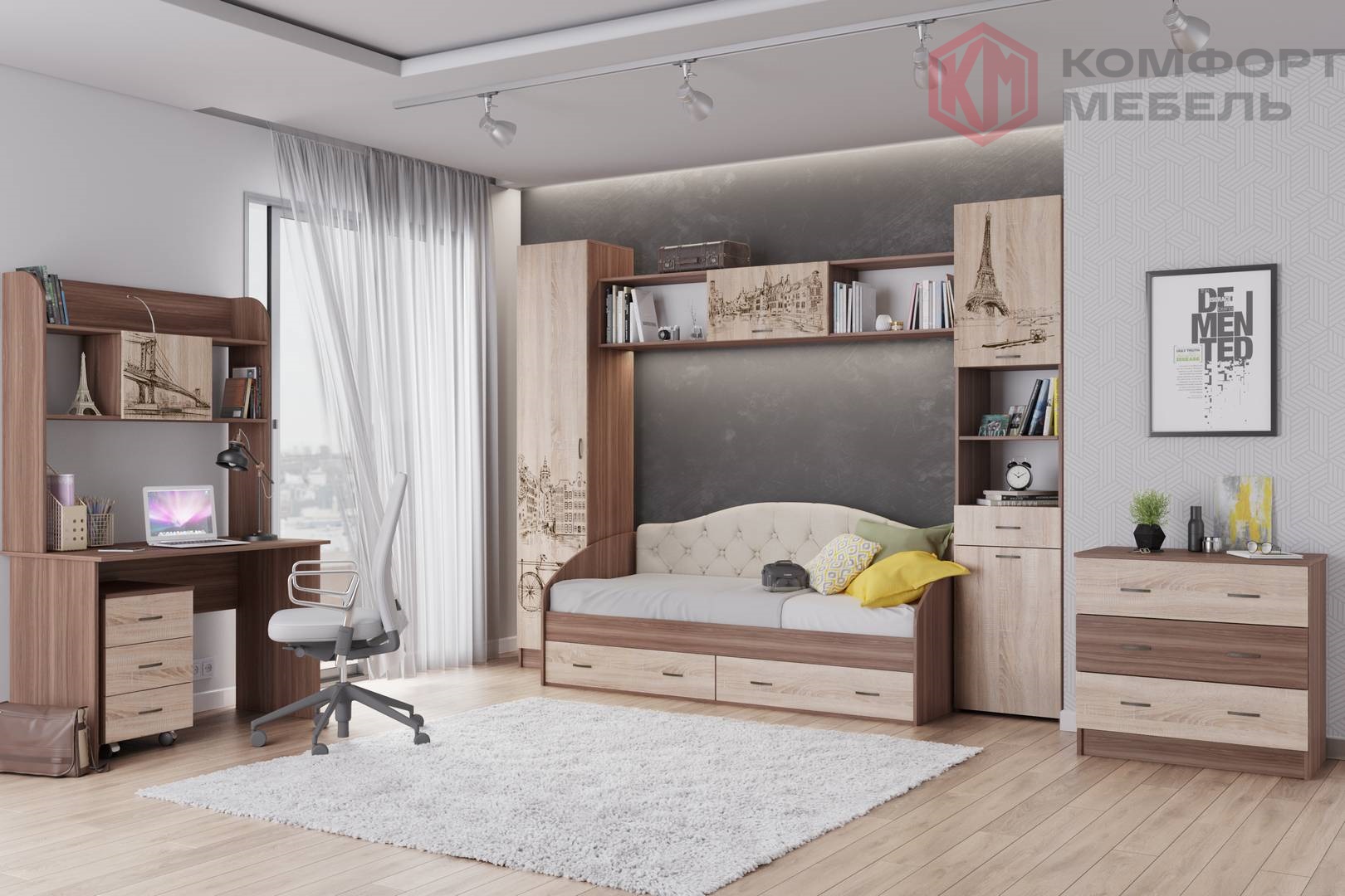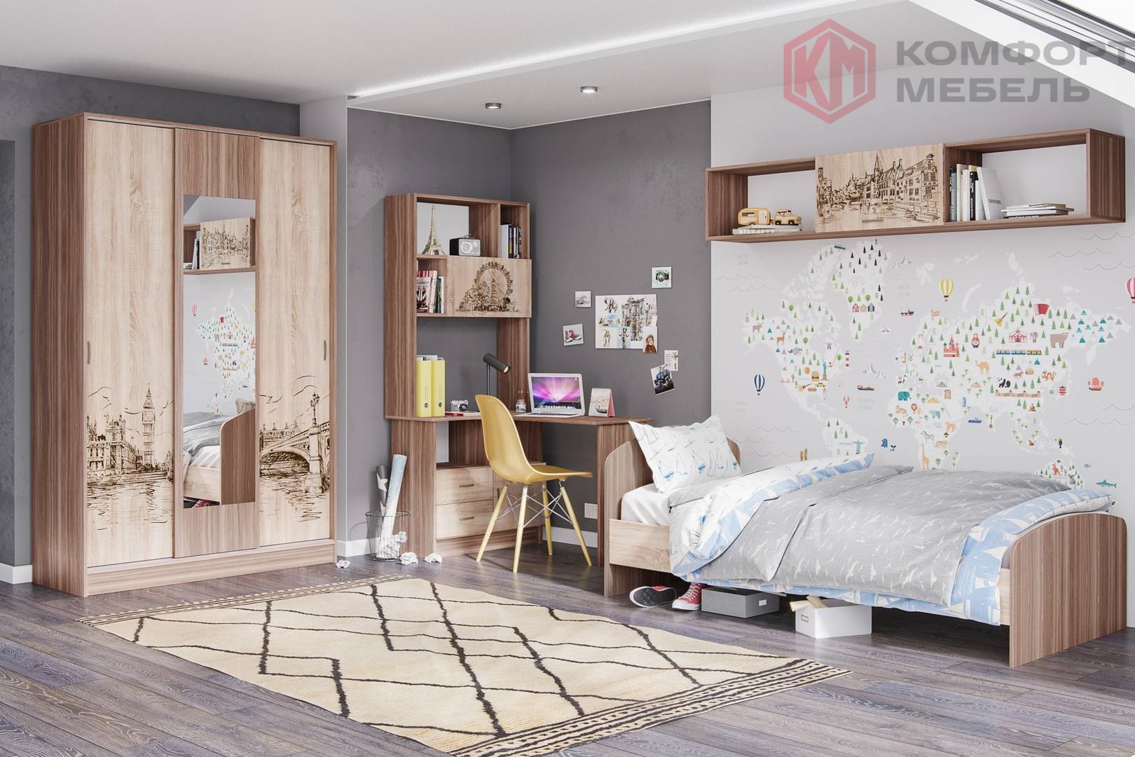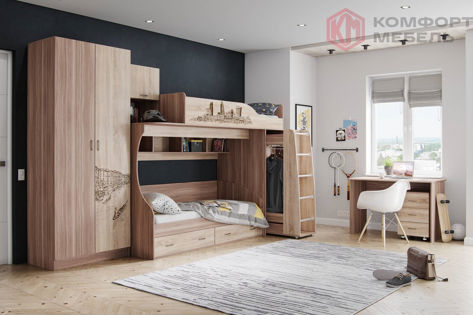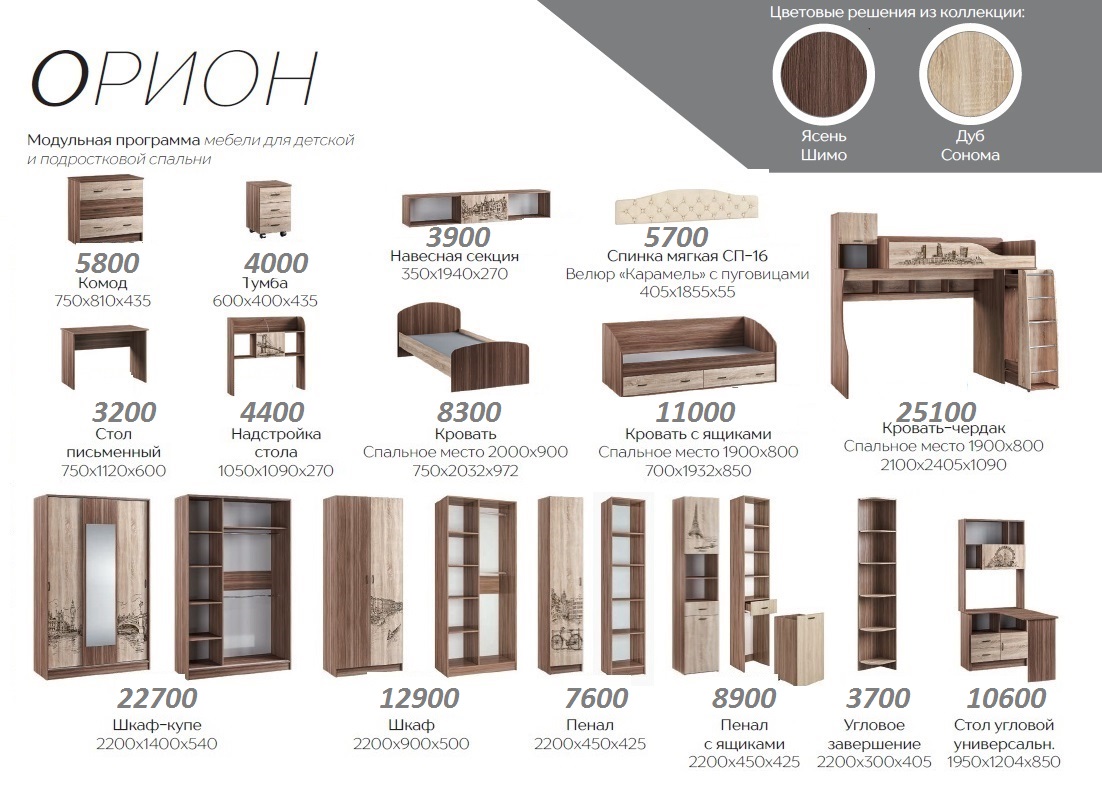 — Широкий выбор модулей: функциональная кровать-чердак, угловой письменный стол, вместительные шкафы.