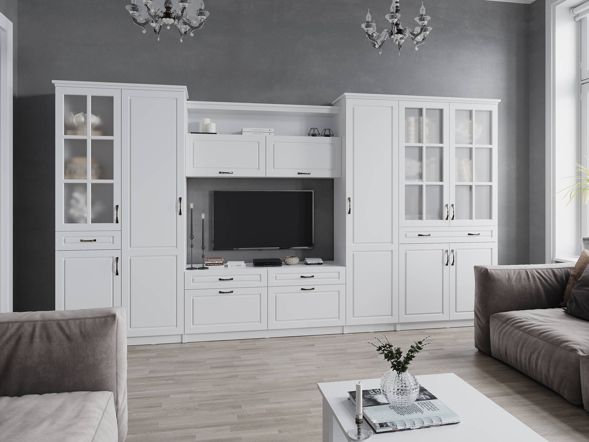 — Модули с витринами комплектуются матовым стеклом «Сатинат»