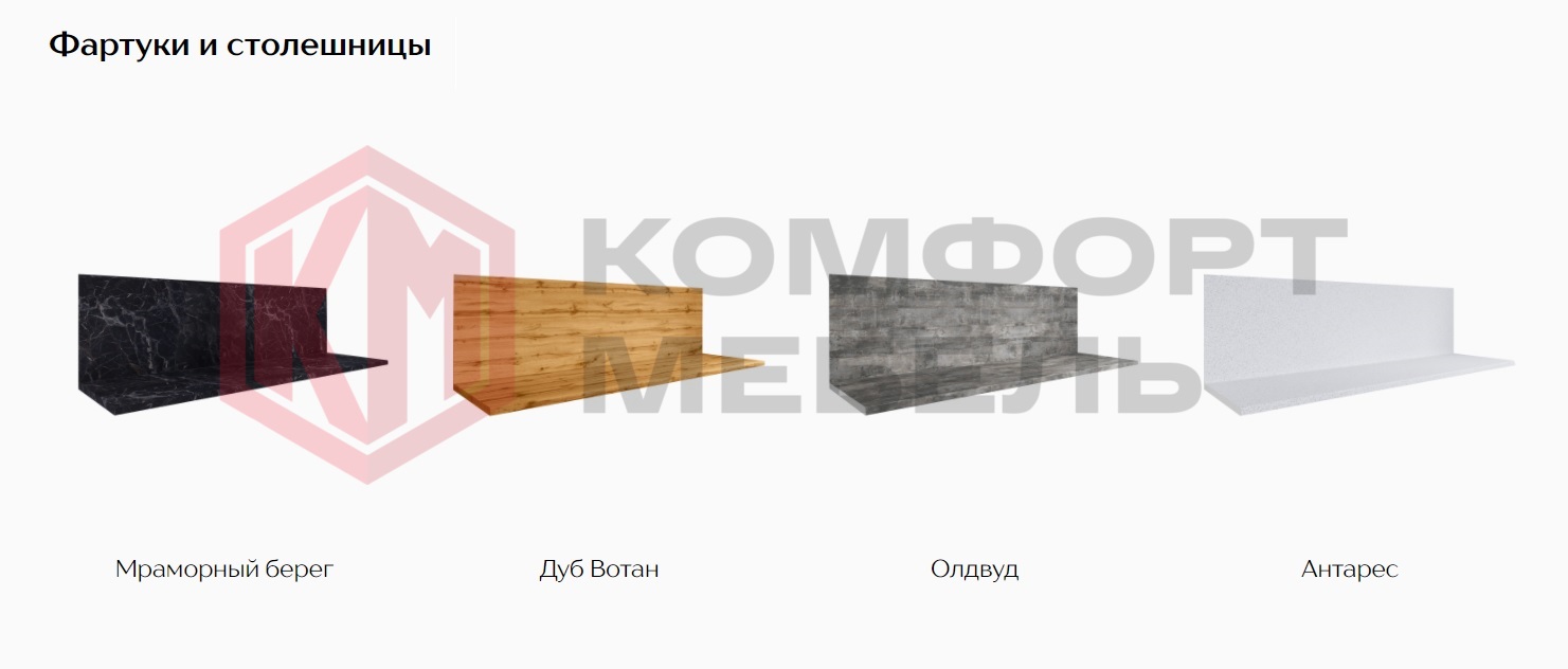 — Столешницы с влагостойким пластиковым покрытием 4 цветов на выбор: Антарес, Мраморный берег, Олдвуд или Дуб Вотан, толщиной 26 или 38 мм