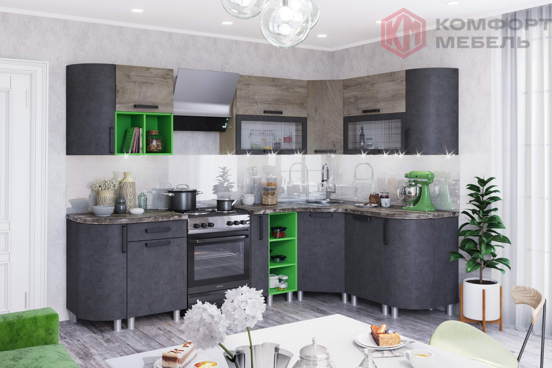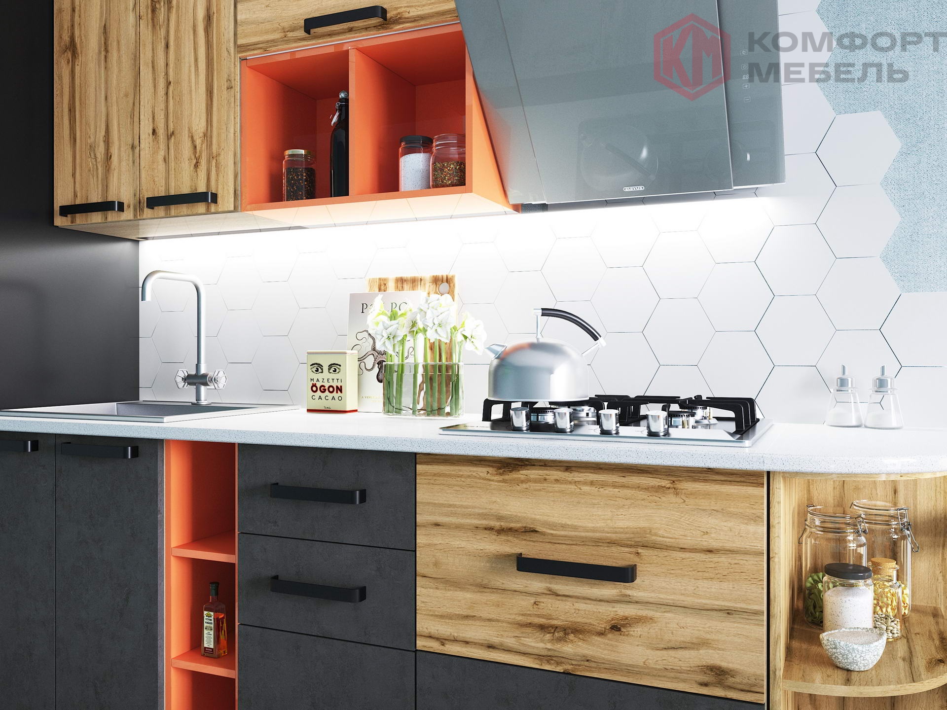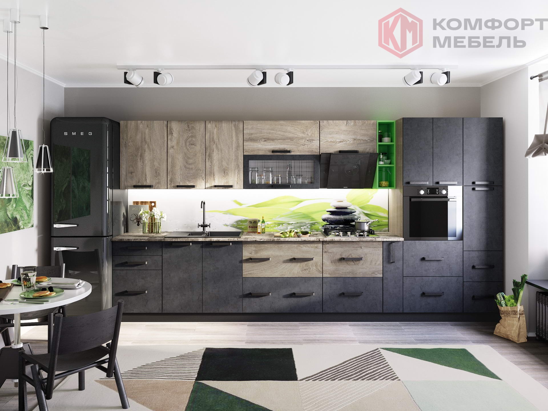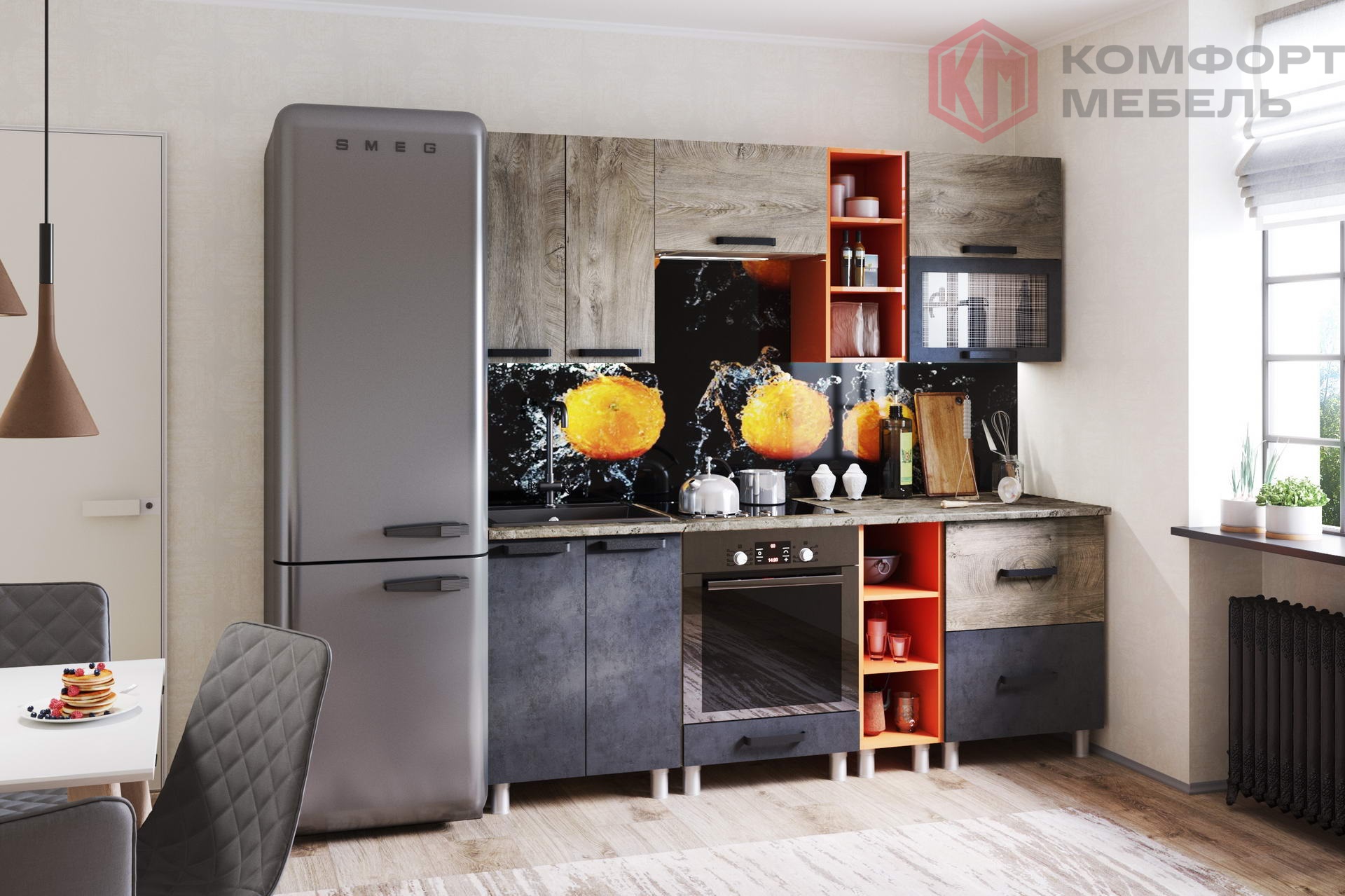 Выраженная структура натуральной древесины, реалистичный декор «под бетон», контрастные цветовые сочетания и присутствие ярких «вспышек» — фишка необычайно стильной и экстравагантной кухни «Крафт».