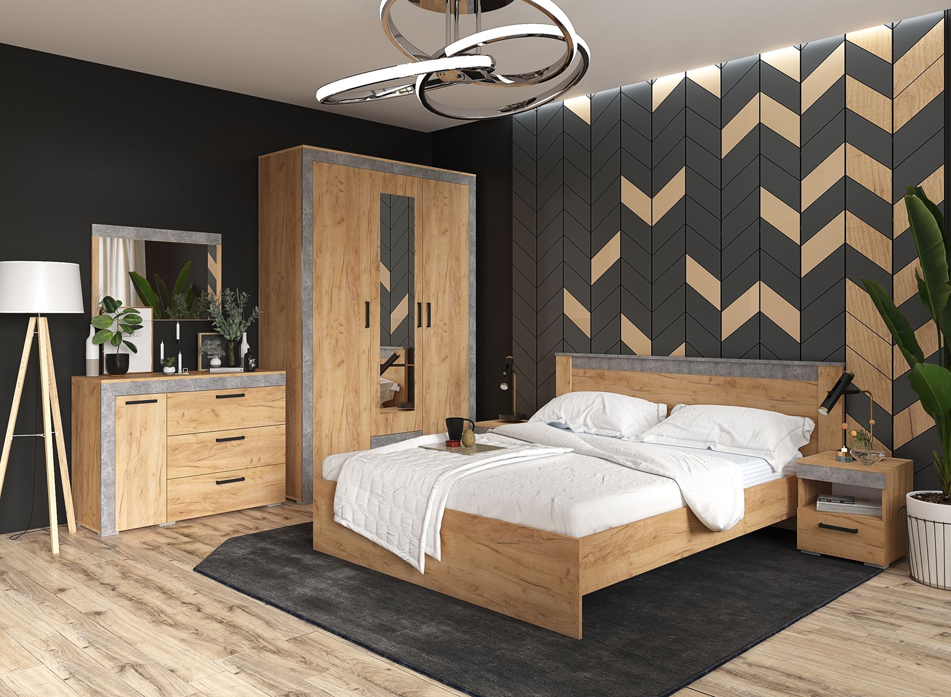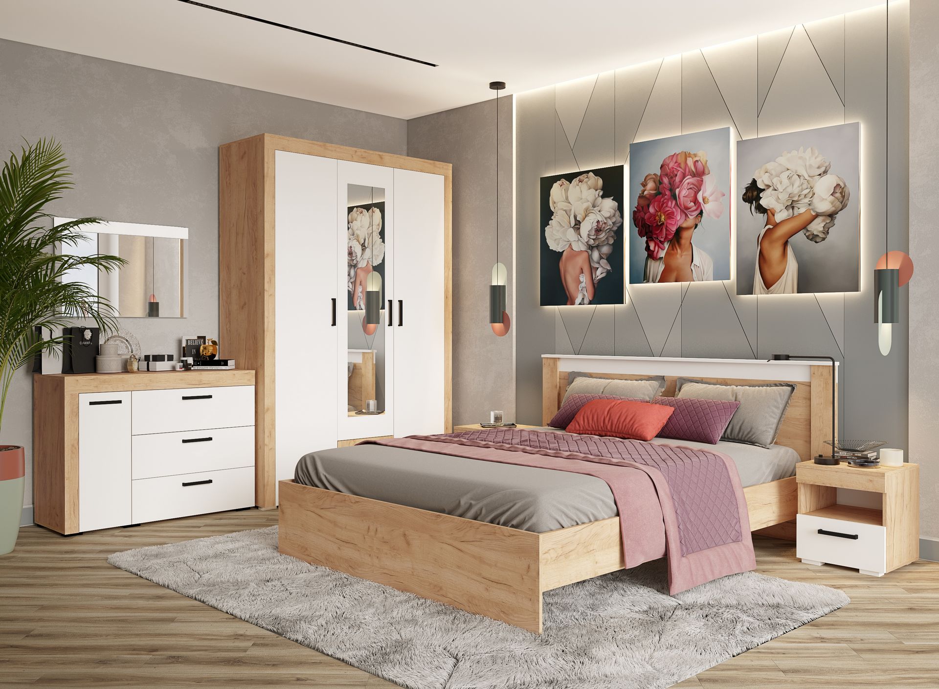 — Спальный гарнитур выполнен в цветах: Белый с тиснением «Древесные поры» и «Дуб Крафт Золотой» или «Дуб Крафт Золотой» и «Ателье светлое».