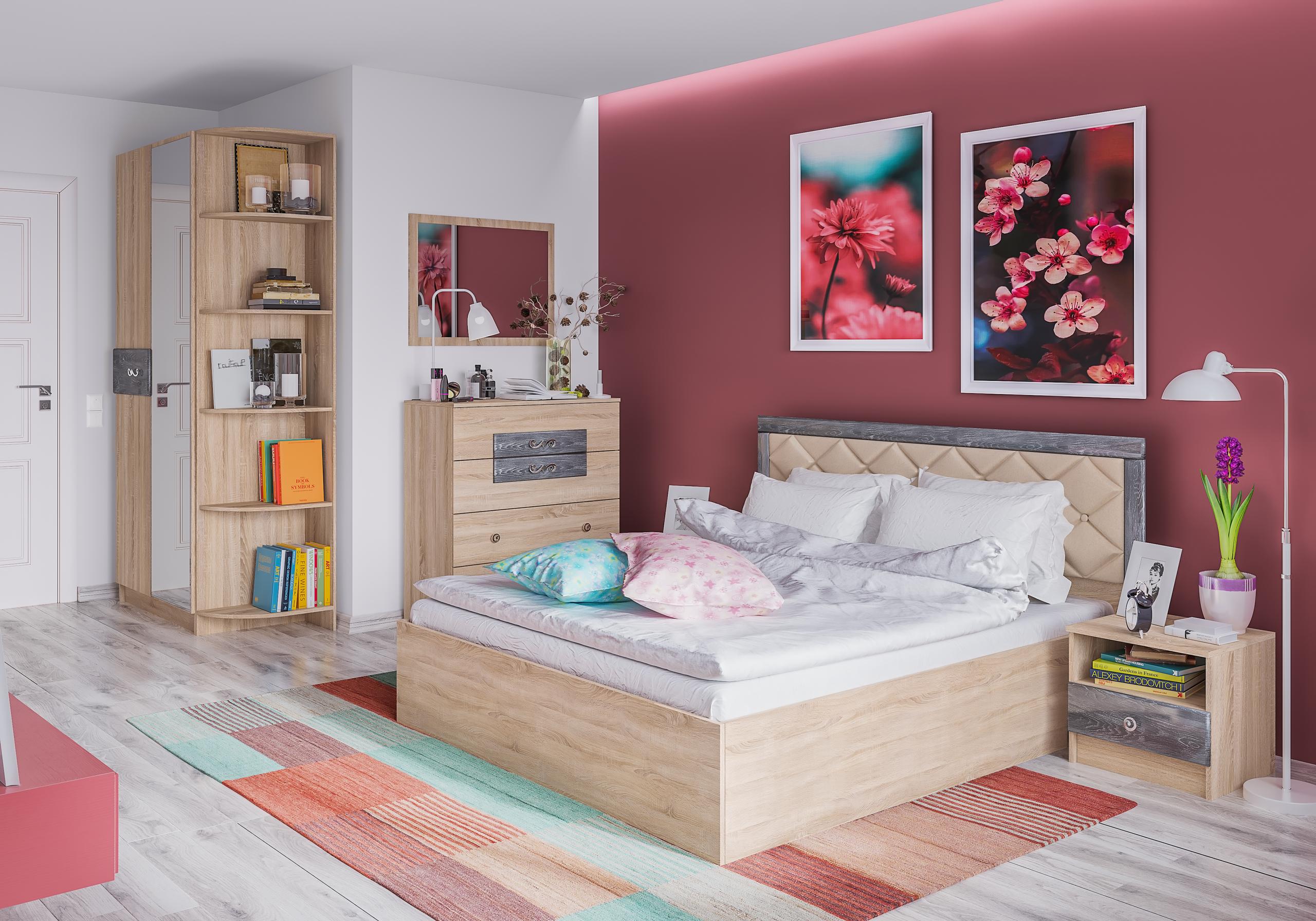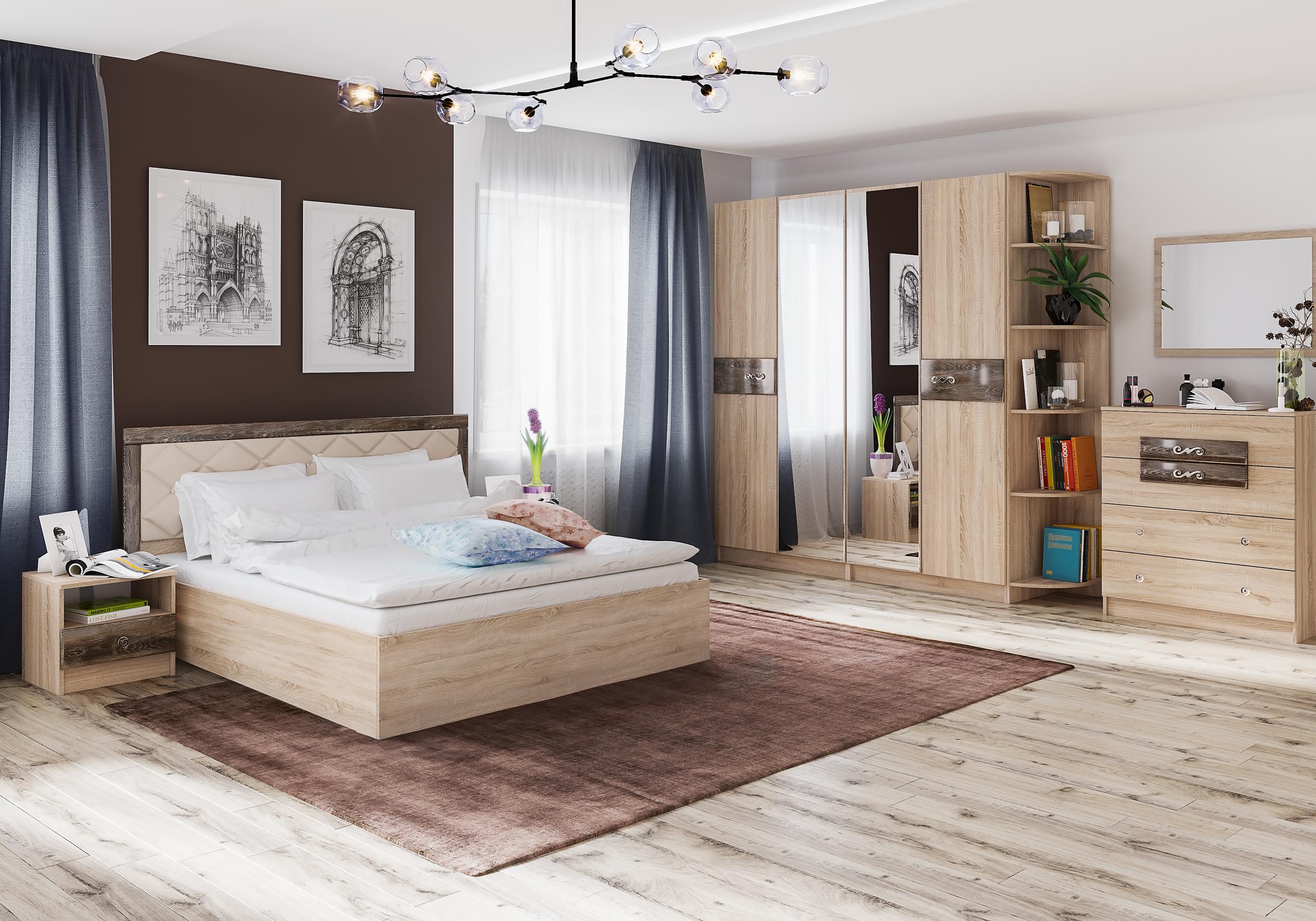 — Спальный гарнитур выполнен в цвете «Дуб Сонома» с накладками из МДФ в пленке ПВХ цвета «Дуб Шале мореный» или «Дуб Шале серебро» и «Ясень Анкор Светлый» с накладками из МДФ в пленке ПВХ цвета «Дуб Бомонд какао».