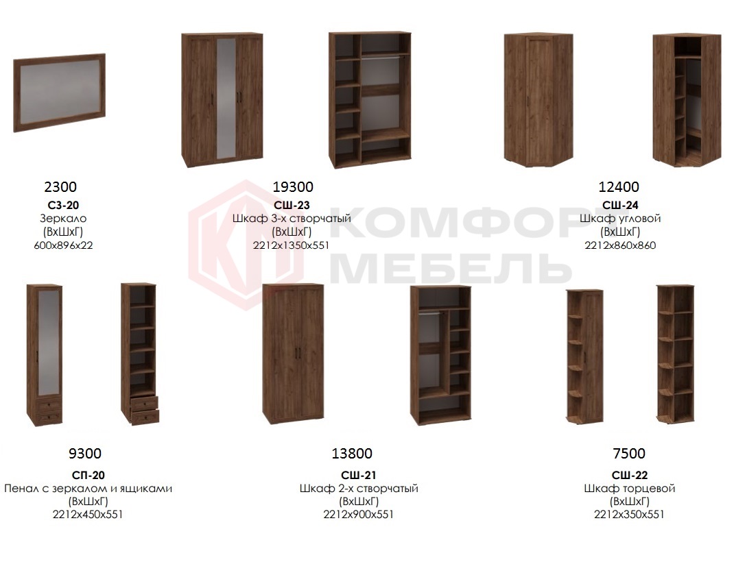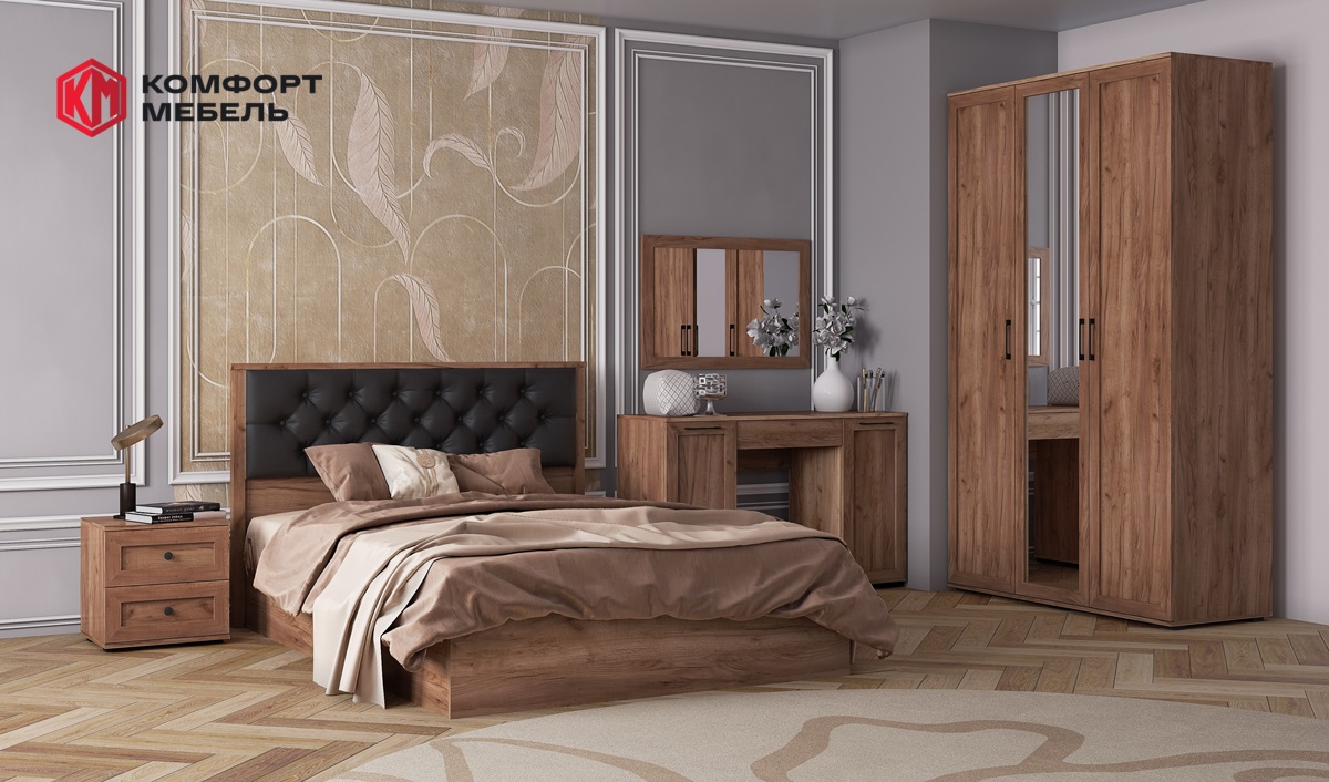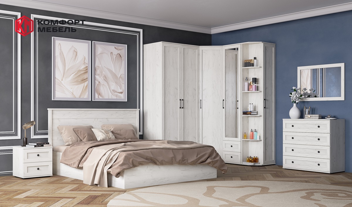 Спальню можно собрать в одном стиле с гостиной. Торцевой шкаф с открытыми и закрытыми полками.
