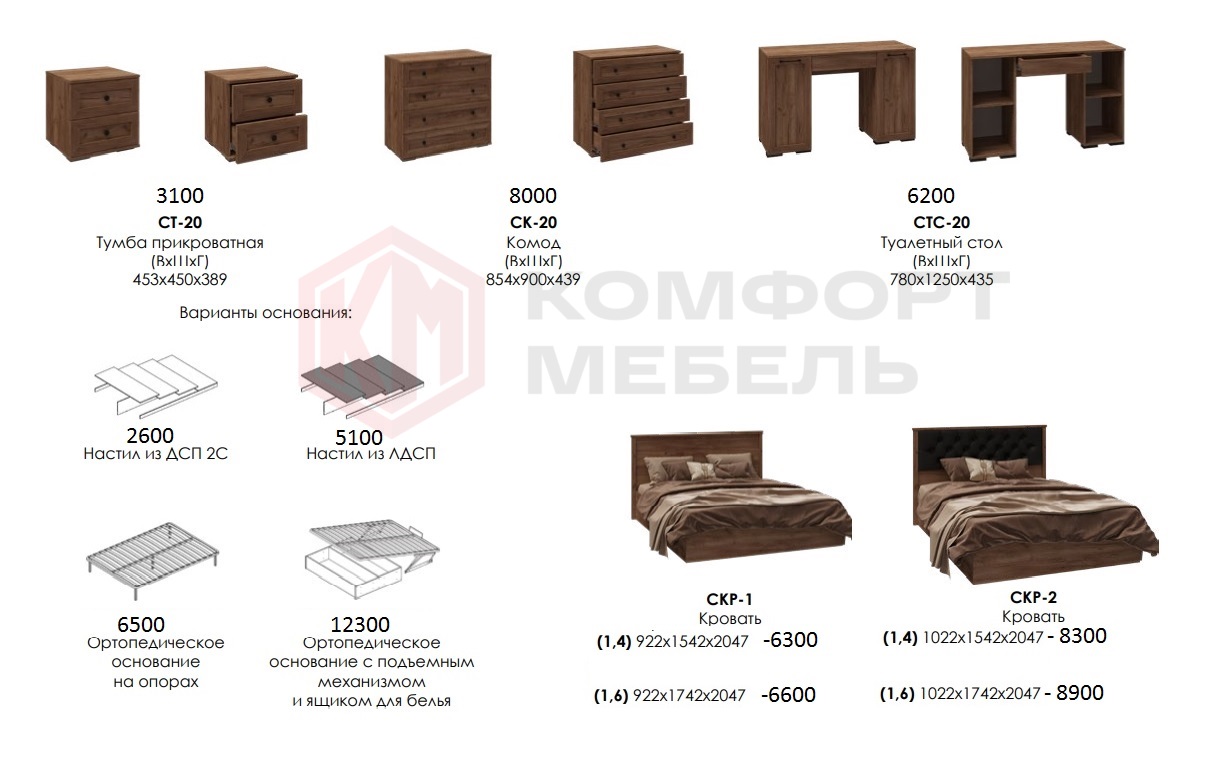 4 варианты основания для кровати: настил из ДСП 2С, настил из ЛДСП, ортопедическое основание на опорах, ортопедическое основание с подъемным механизмом и ящиком для хранения белья.