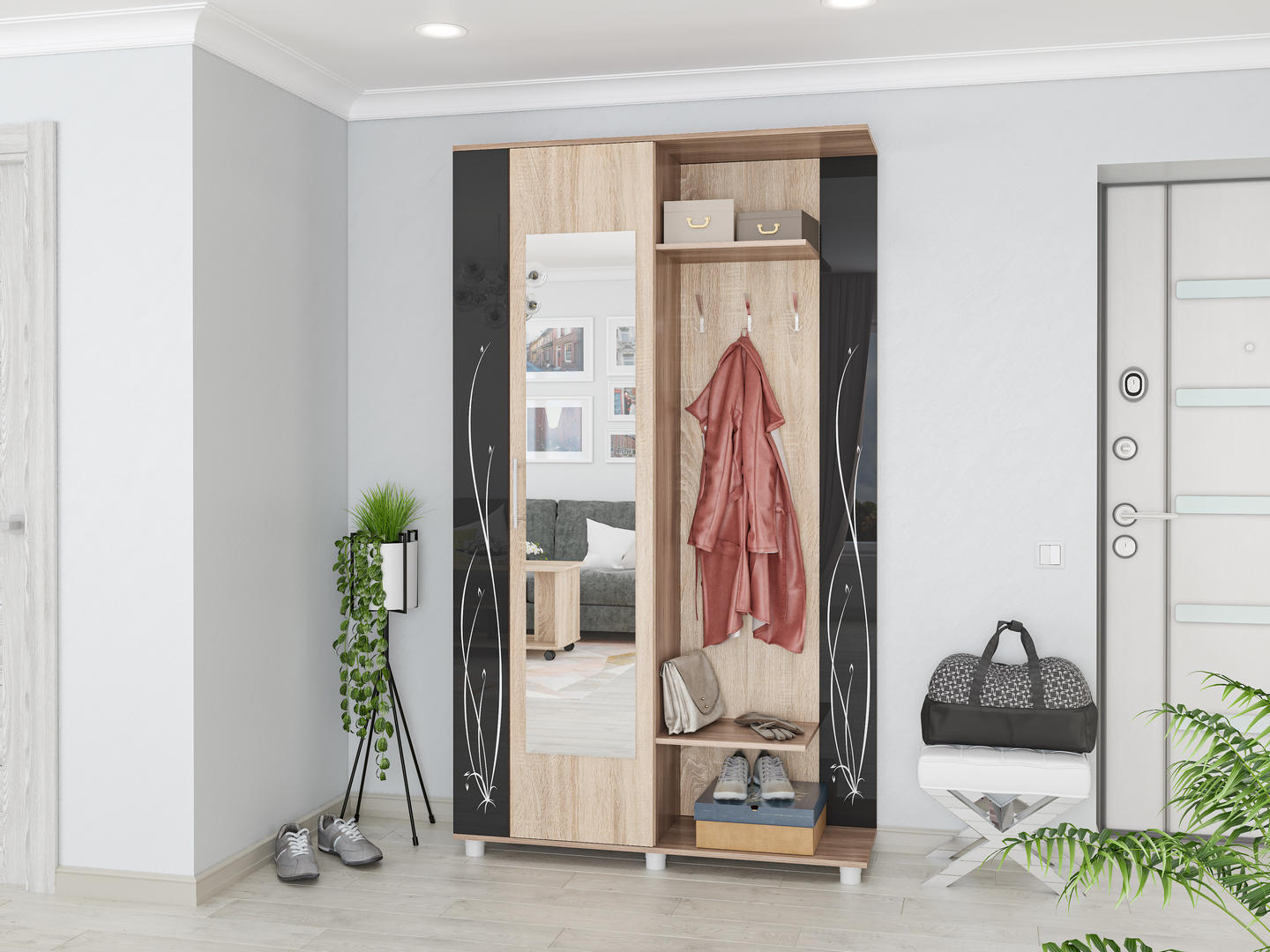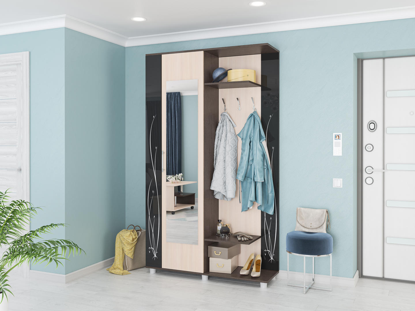 — Вместительный шкаф с металлической выдвижной штангой, полка для мелочей и открытая секция с крючками под одежду